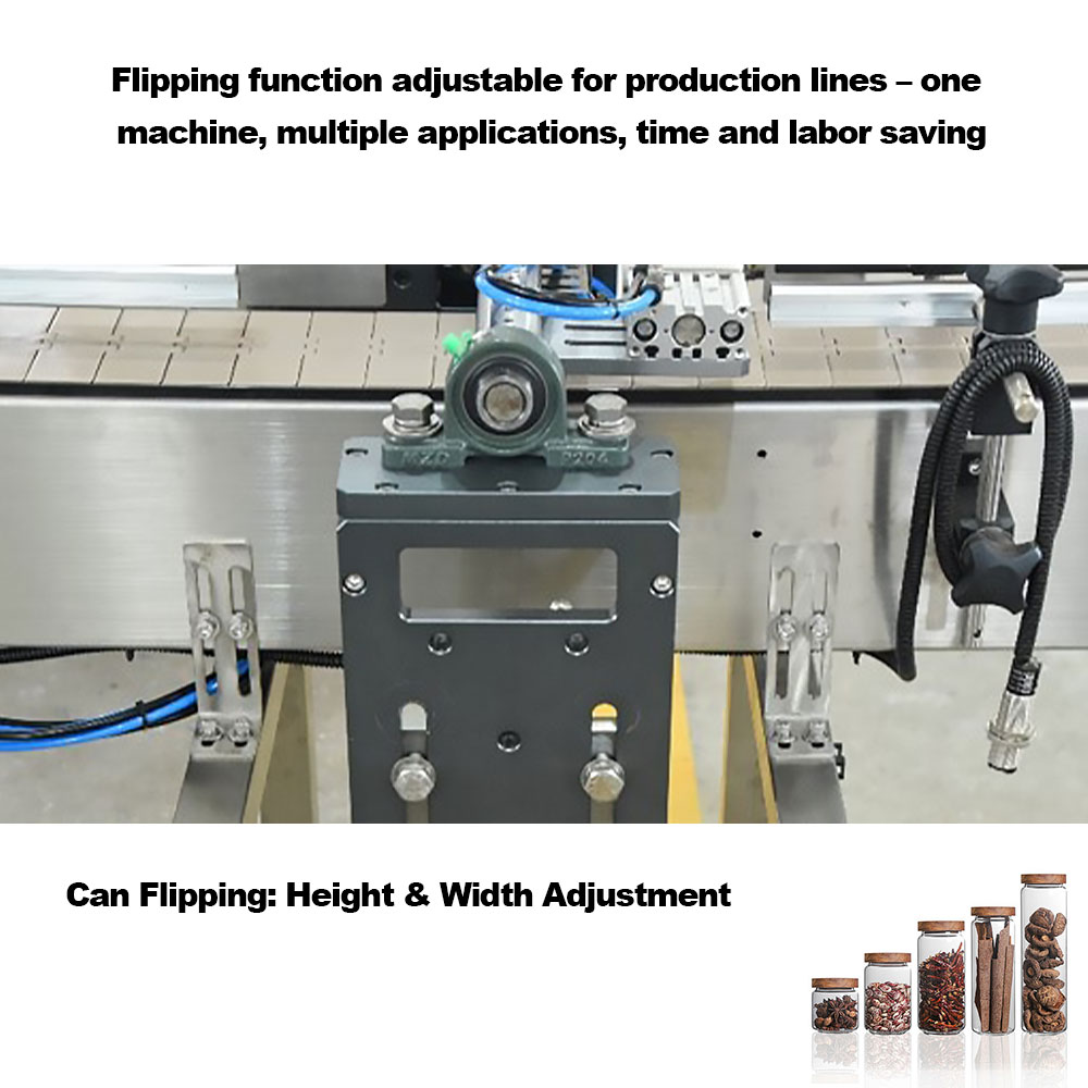 The machine is made of a filp shaft, a drive motor and symmetrical clamping components. Here's how they work efficiently: the drive motor let the turning shafr to rotate, a set of clamping components also rotate simultaneously. These components clamp the middle of the bottle or jar and flip them 180 degrees.